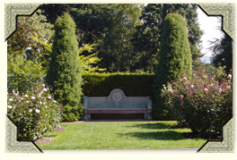 The formally designed garden also features a stone bench honoring Jesse A. Currey, founder of the International Rose Test Garden.